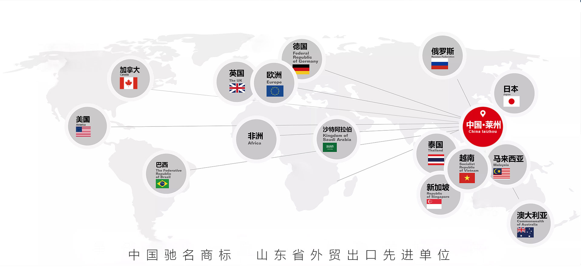 • 產品遠銷美國、加拿大、澳大利亞、荷蘭、中東、非洲等三十多個國家和地區,在阿聯酋迪拜設有駐外分公司。